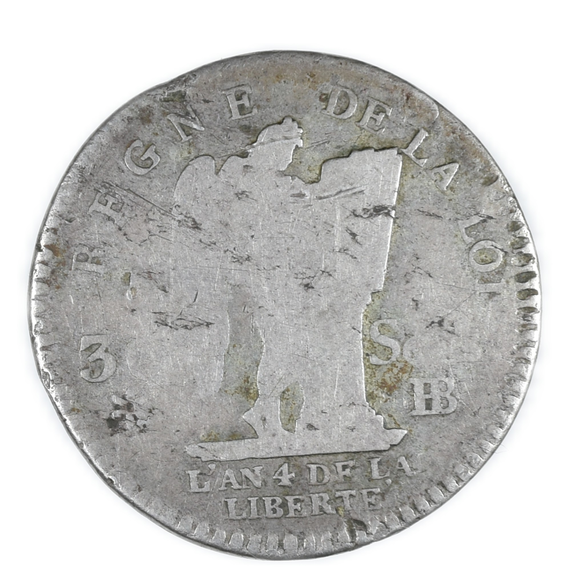 Titulature revers : REGNE DE LA LOI / 30 SOLS BB/ L’AN 4 DE LA LIBERTE.
