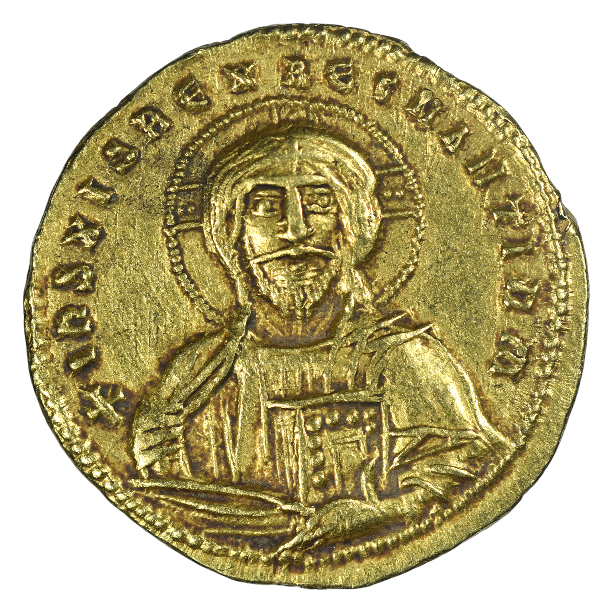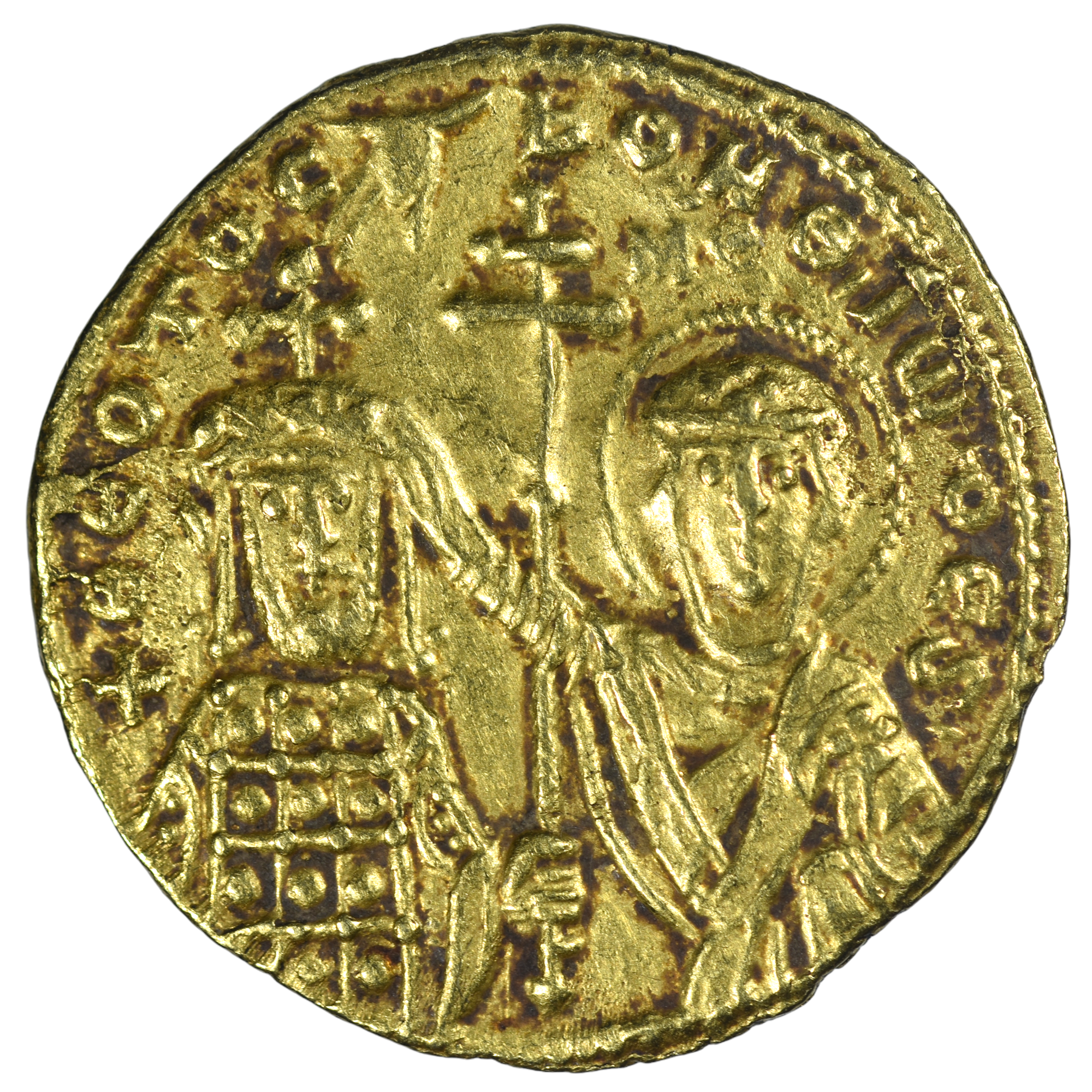 Description revers: Bustes vus à mi-corps de la Vierge à droite qui couronne Jean Ier à gauche ; la Vierge est nimbée et vêtue de la stola et du maphorium, Nicéphore II est couronné avec pendilia bouletés, vêtu du loros ; Jean tient un globe surmonté d’un trèfle et est couronné par la main de Dieu sortant du ciel ; entre les deux, une croix.