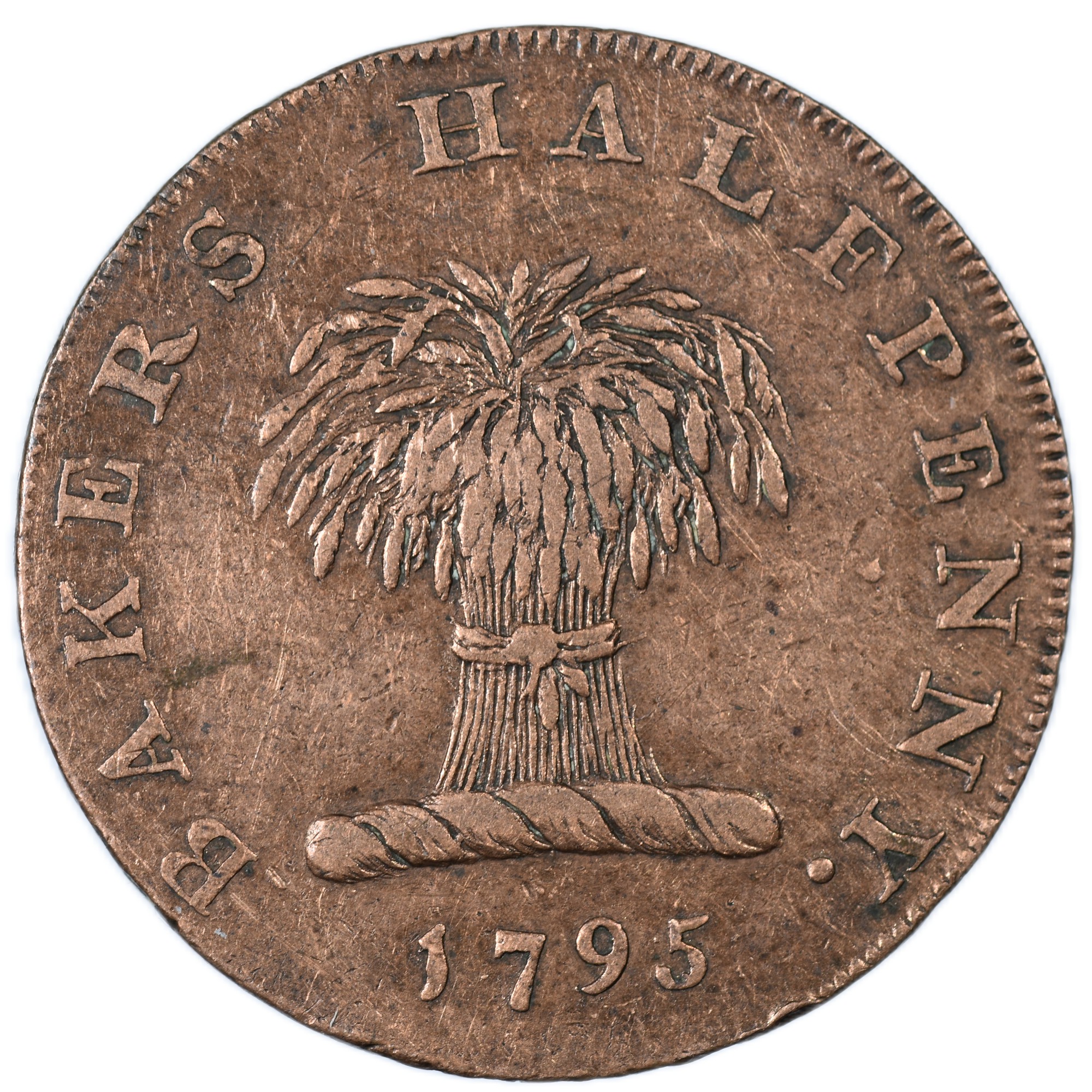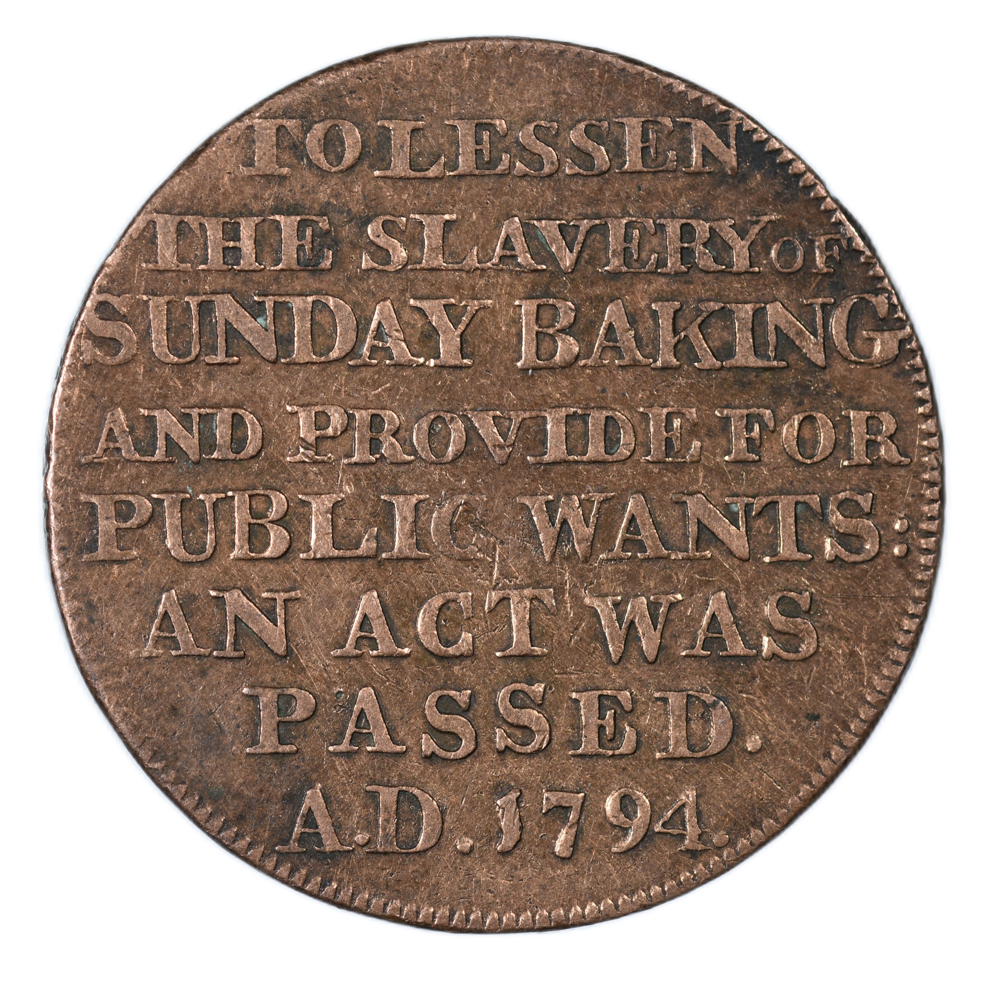 Titulature avers: AKERS HALFPENNY 1795 / TO LESSEN THE SLAVERY OF SUNDAY BAKING AND PROVIDE FOR PUBLIC WANTS: AN ACT WAS PASSED. AD.1791.