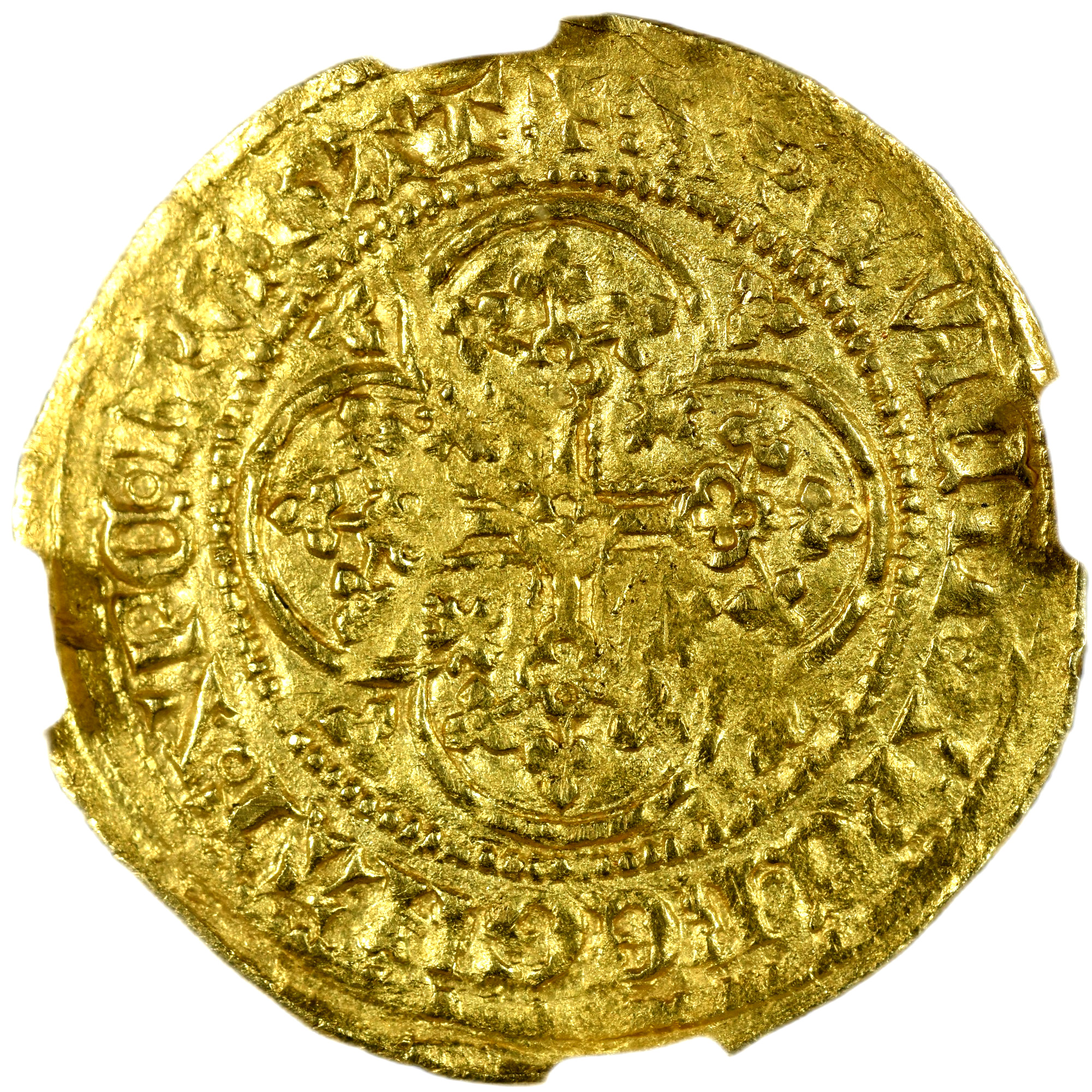 Description revers: Croix fleuronnée dans un quadrilobe cantonné de quatre trèfles.