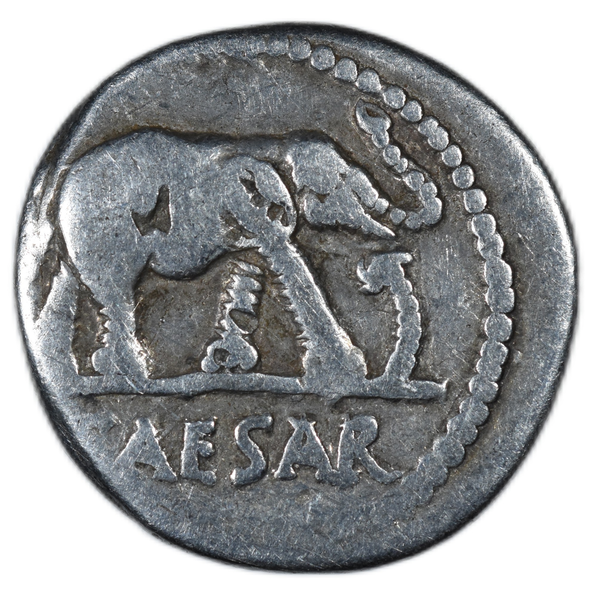 Description avers : Eléphant passant à droite ; à ses pieds, un serpent (ou carnyx, trompette gauloise).
