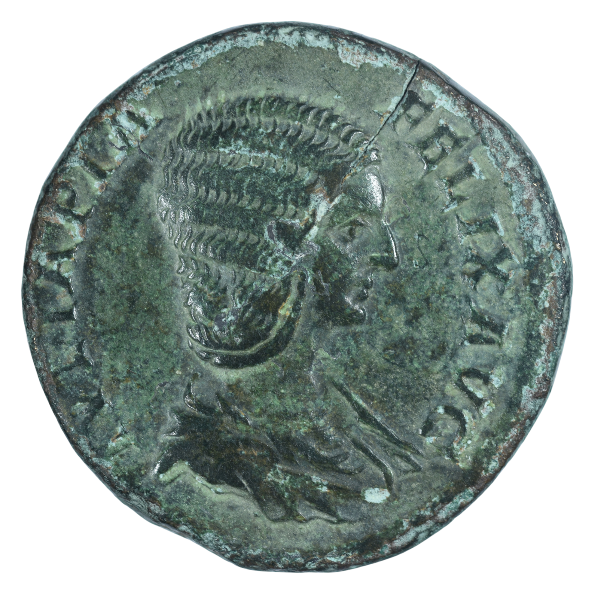Description avers : Buste drapé de Julia Domna à droite, vu de trois quarts en avant, la chevelure en tresses, ramenées derrière la tête (L).