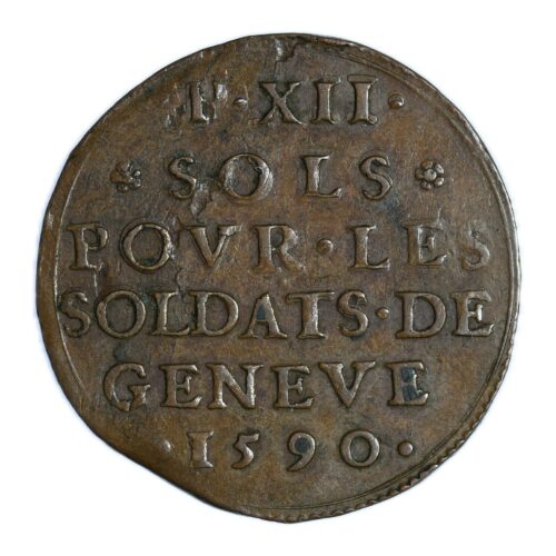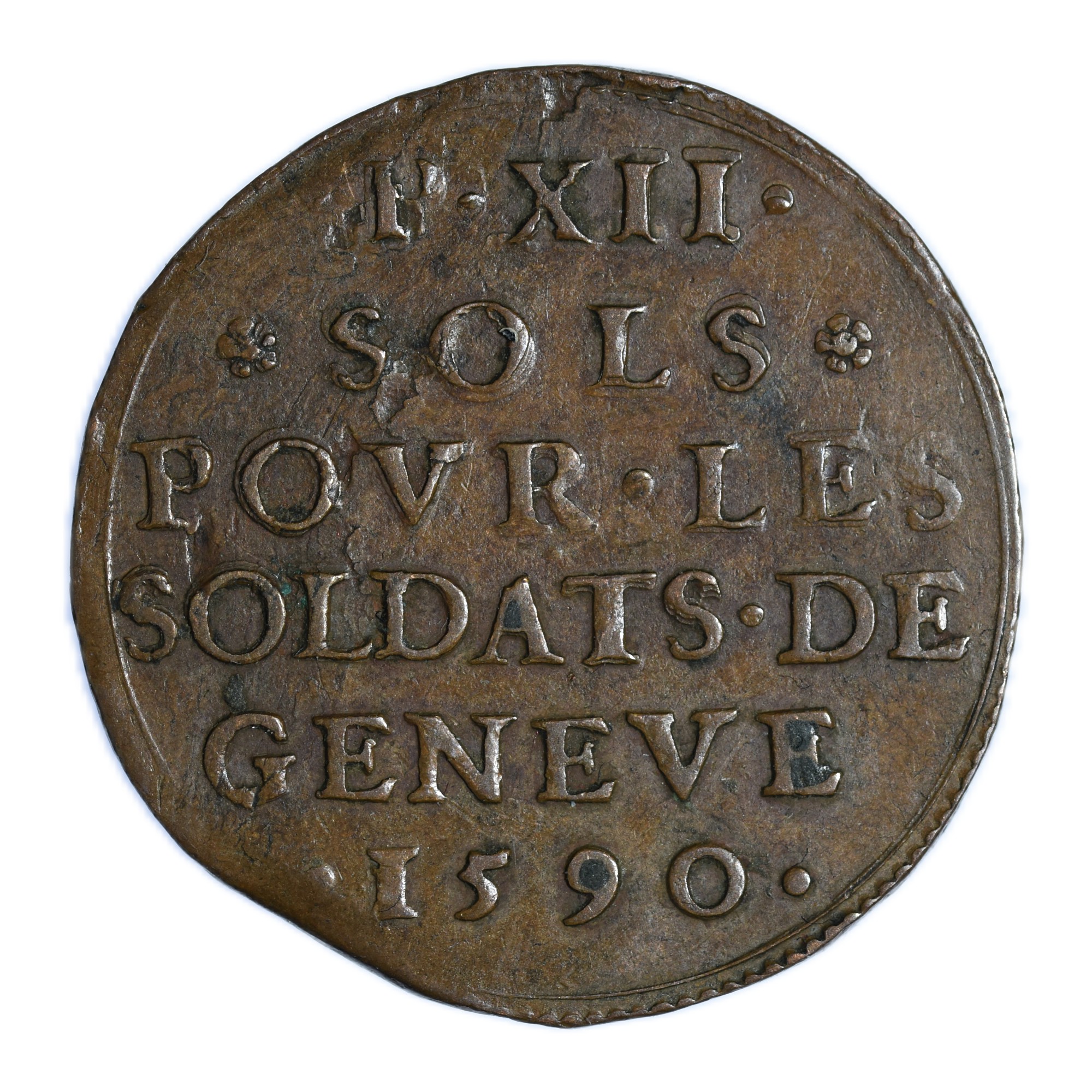 Titulature avers: P XII SOLS POVR LES SOLDATS DE GENEVE 1590.