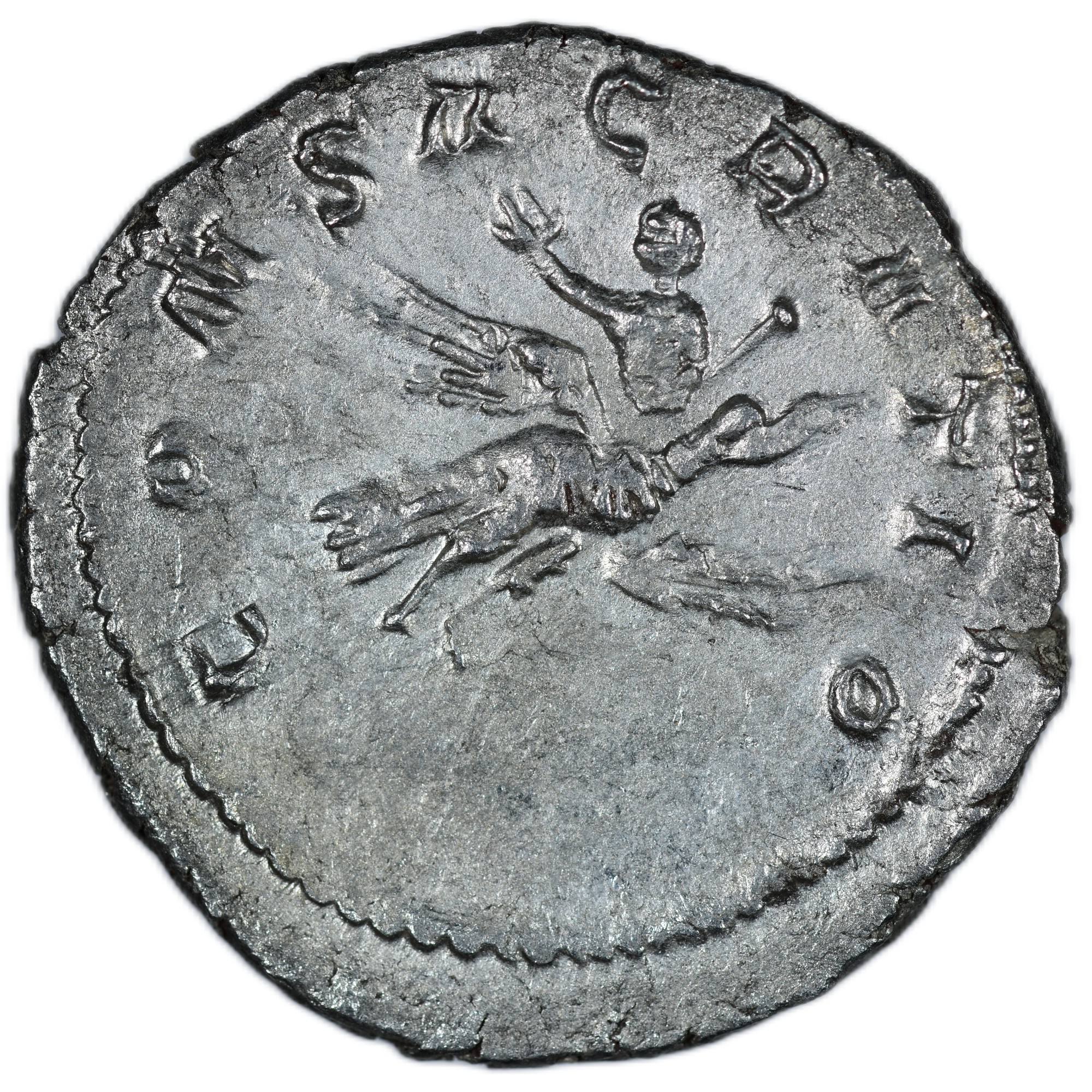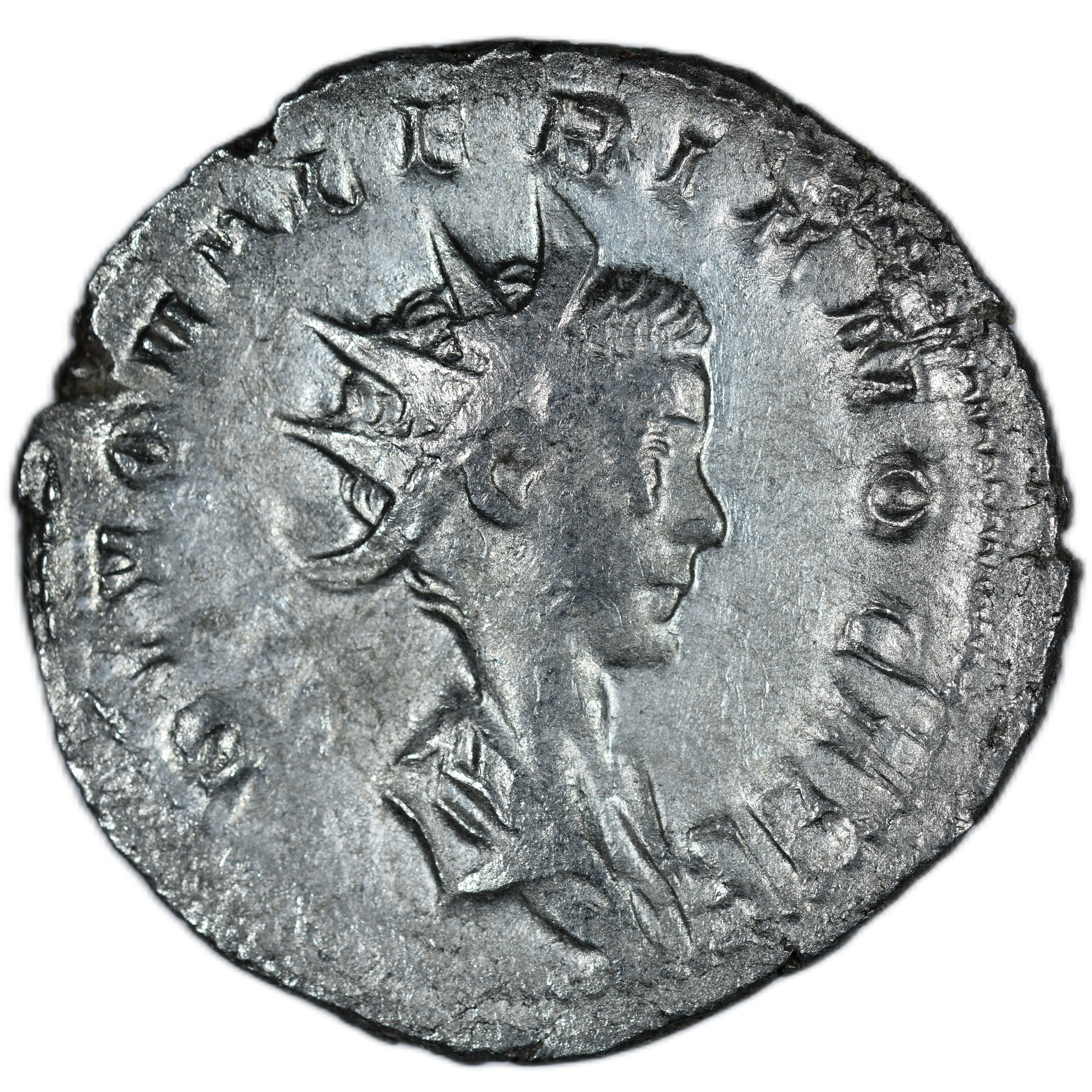 Description avers : Buste radié et drapé de Valérien II à droite, vu de trois quarts en arrière.